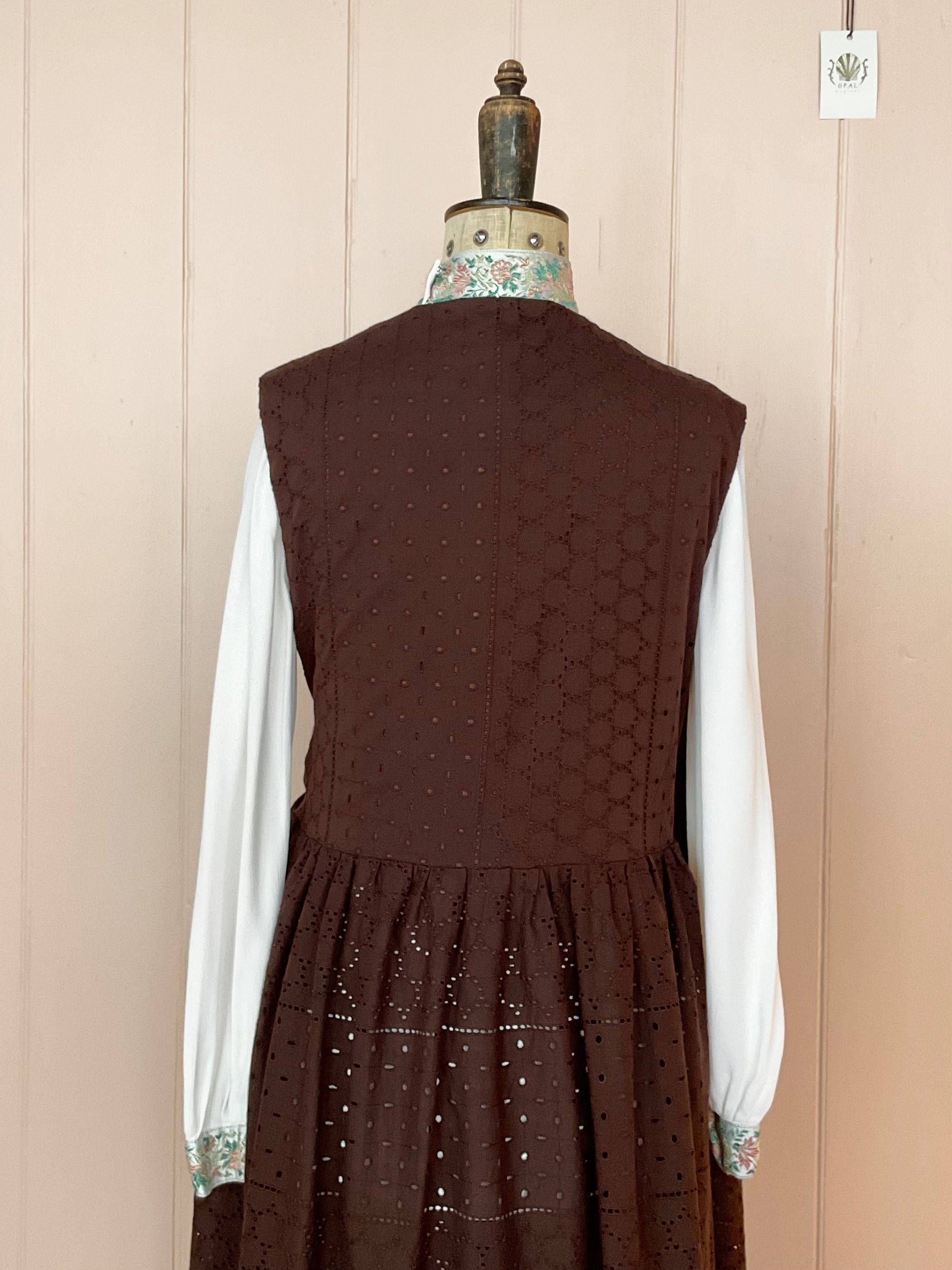 The Barbara Pinafore dress is a super versatile wardrobe addition. Created in our shop in the heart of Margate, the Barbara is made from a beautiful chocolate broderie anglaise. Wear Barbara over a simple T-shirt, layered over your favourite knit, or on warmer days just wear her as she comes!
