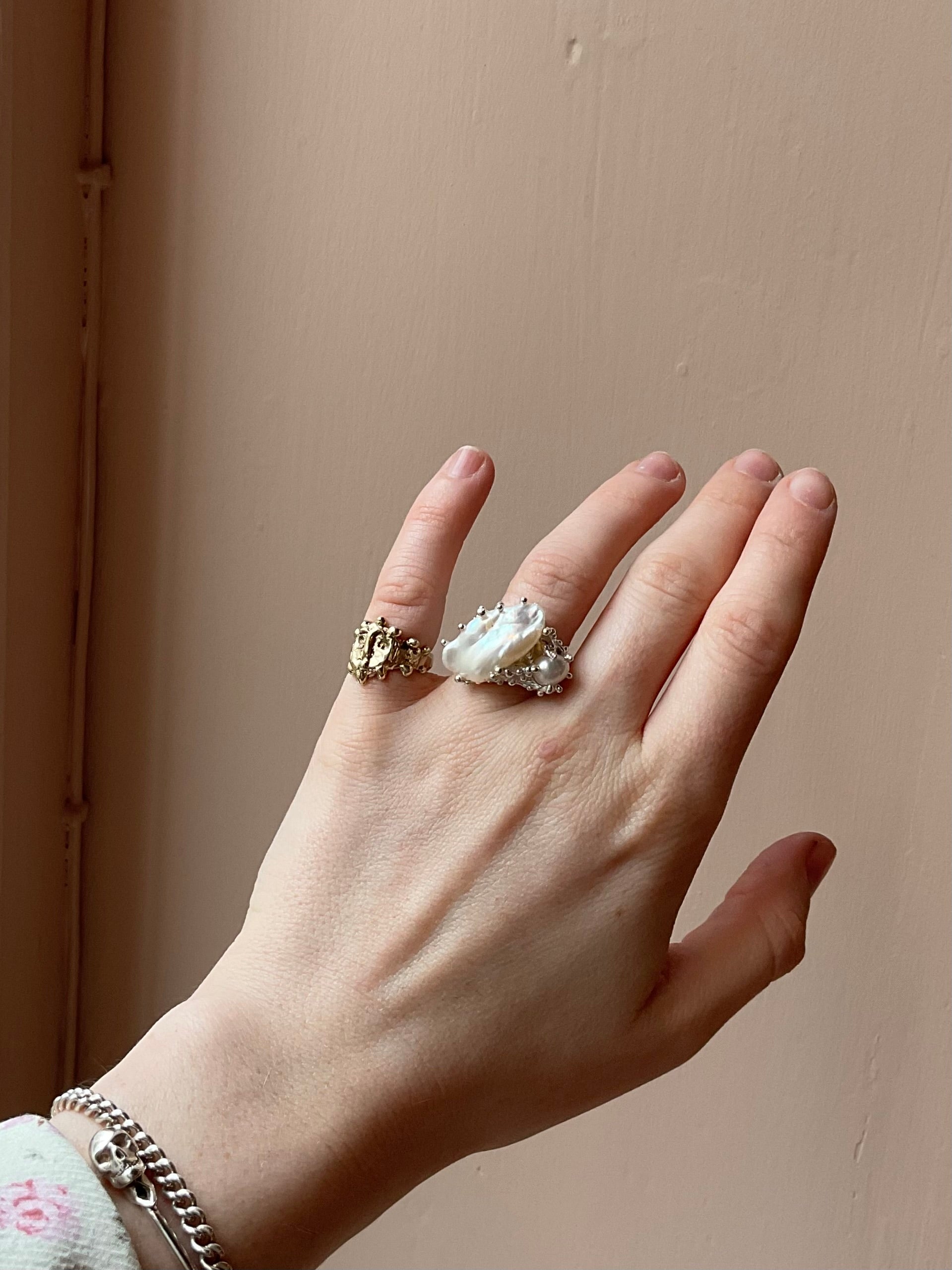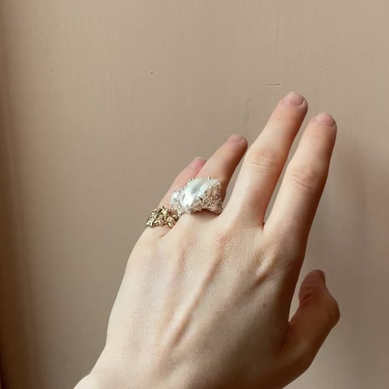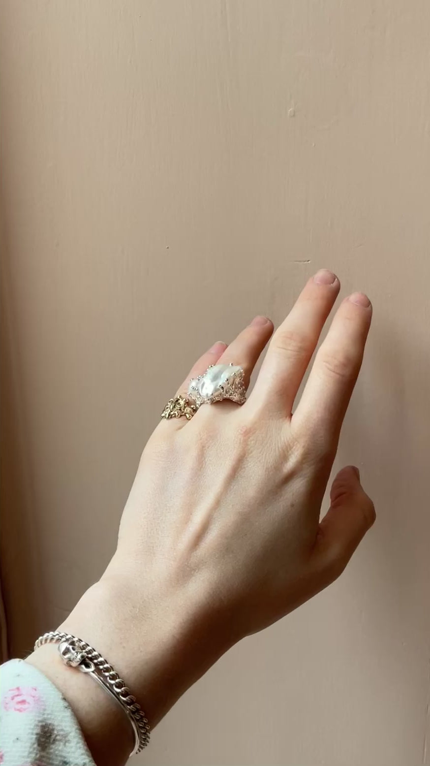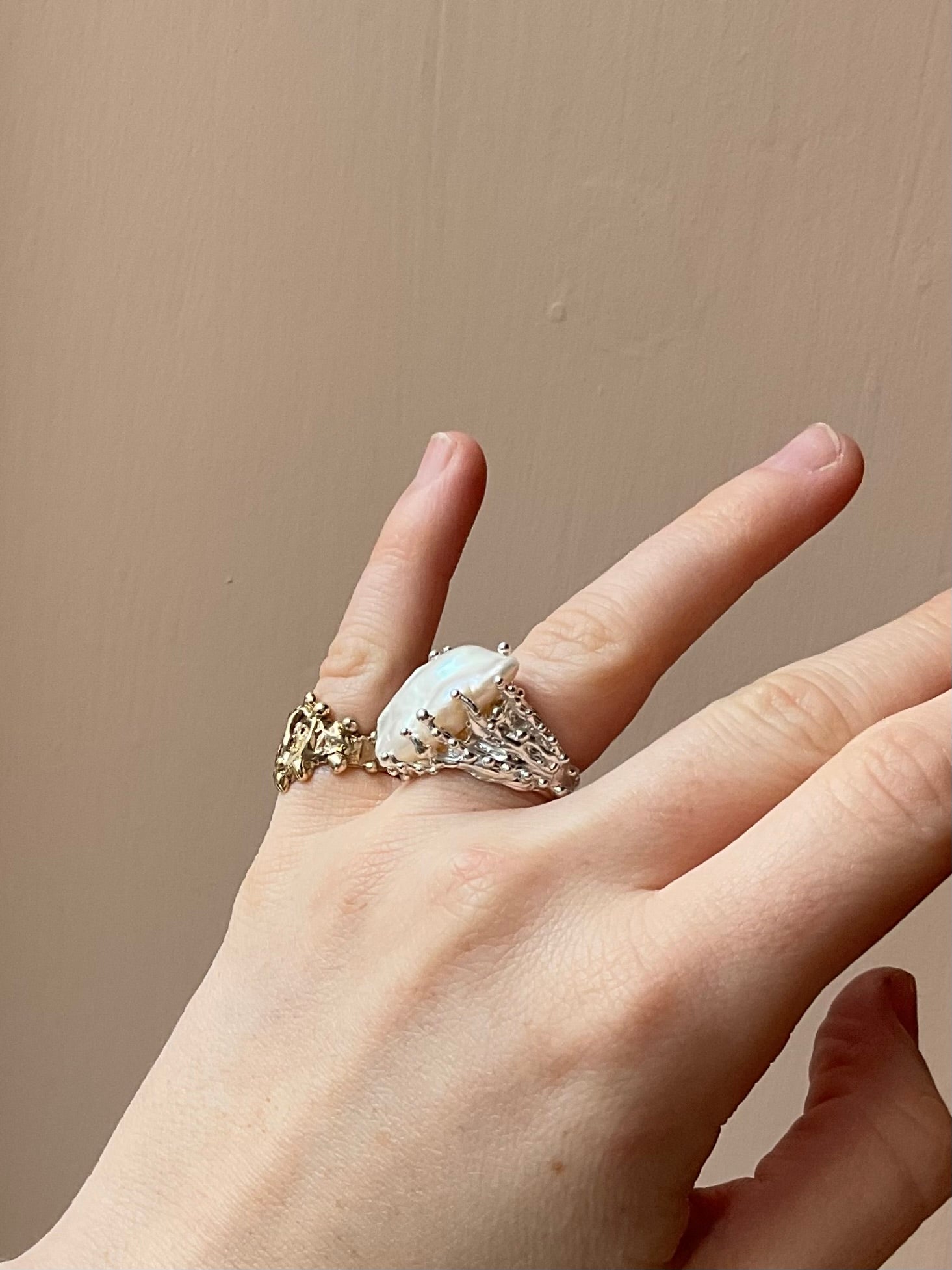 Handmade in Margate, the Coral Reef #1 ring is a chunky, organically shaped ring, heavily adorned in barnacle-like granulation, curved coral inspired claws gracefully clasp a chunky freshwater pearl and a second, smaller pearl.