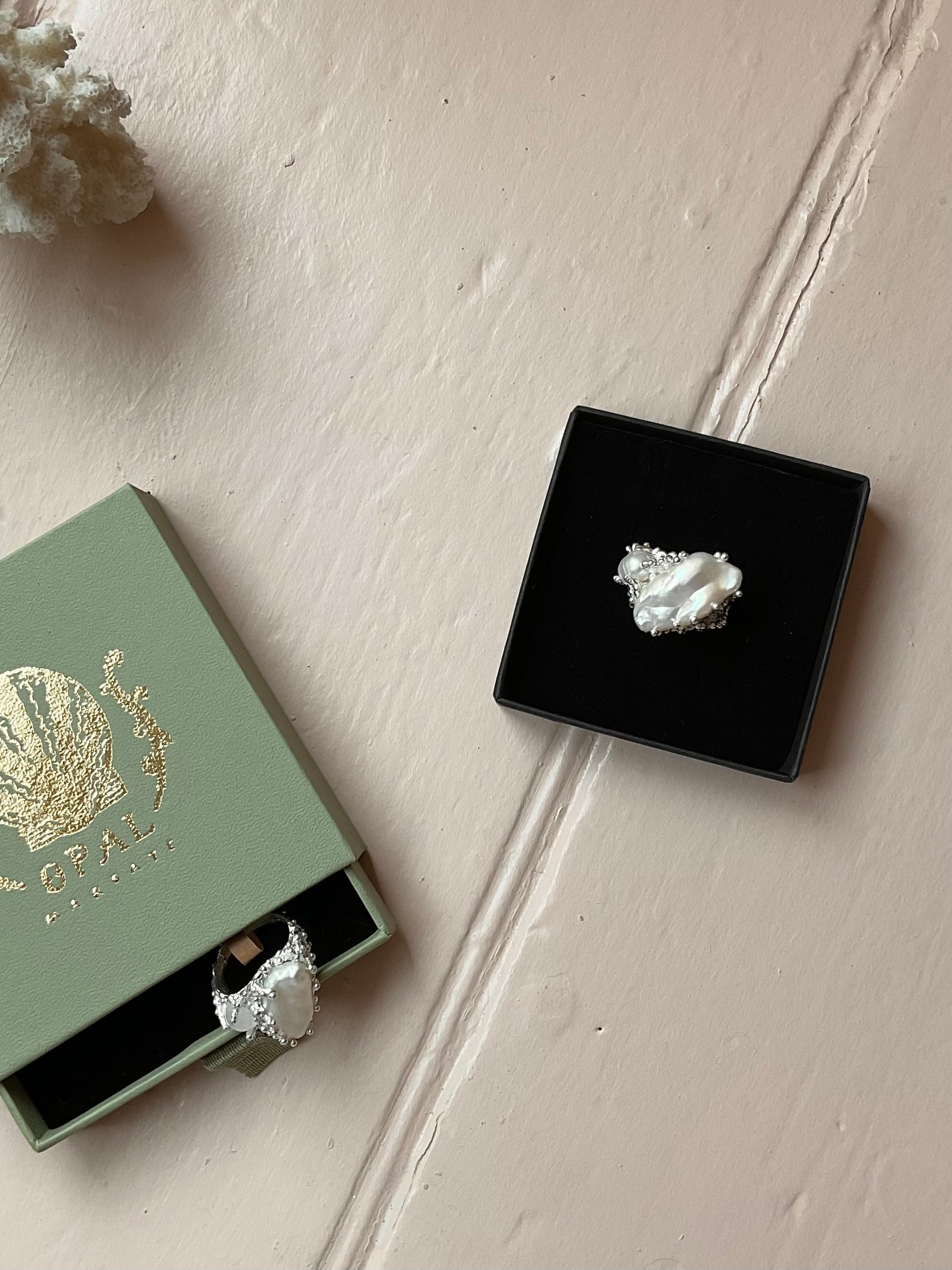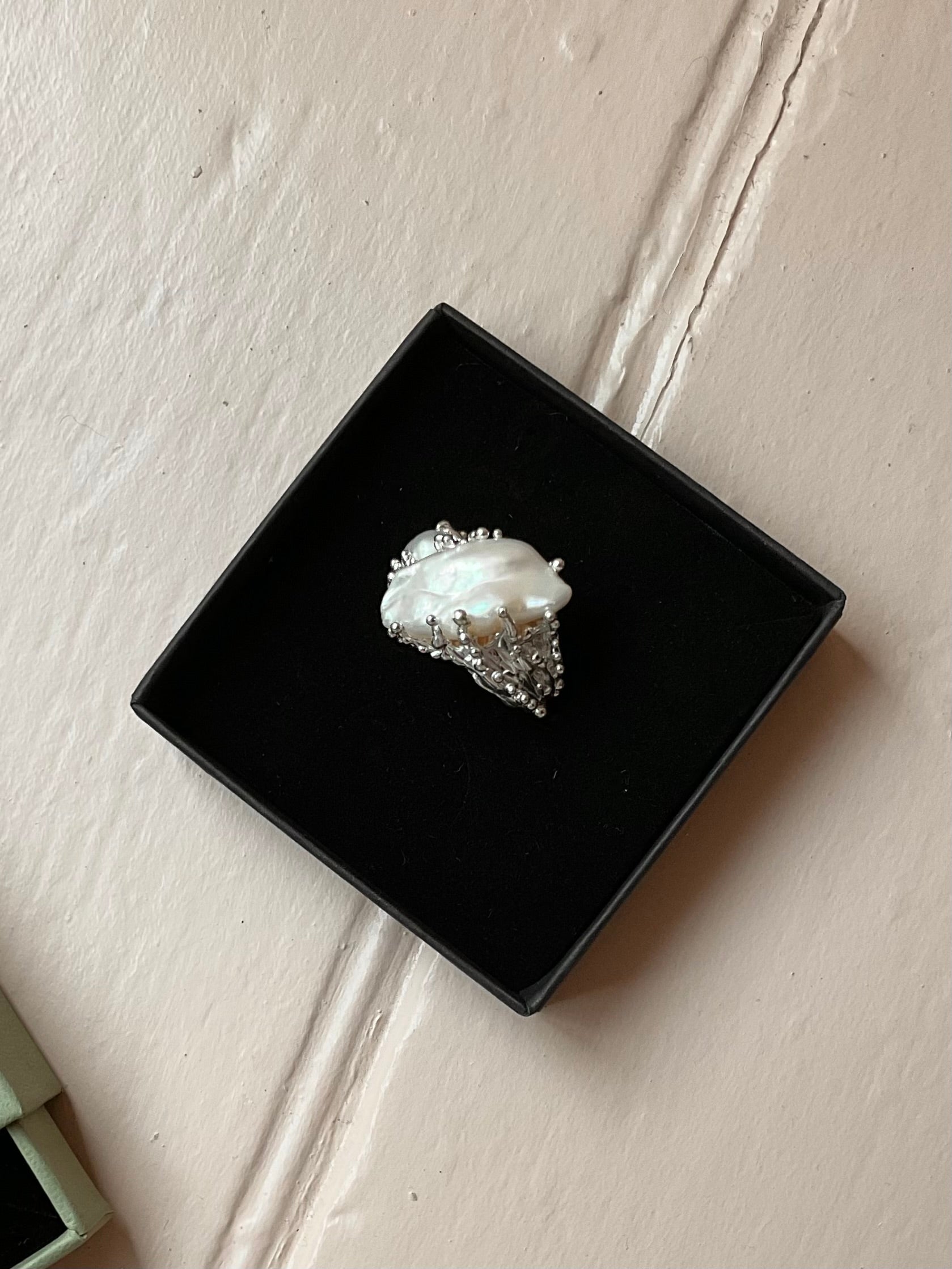 A statement ring, pearls should be treated with care, keep away from perfumes and harsh chemicals. To clean, simply while over with a silver polishing cloth or use warm soapy water.