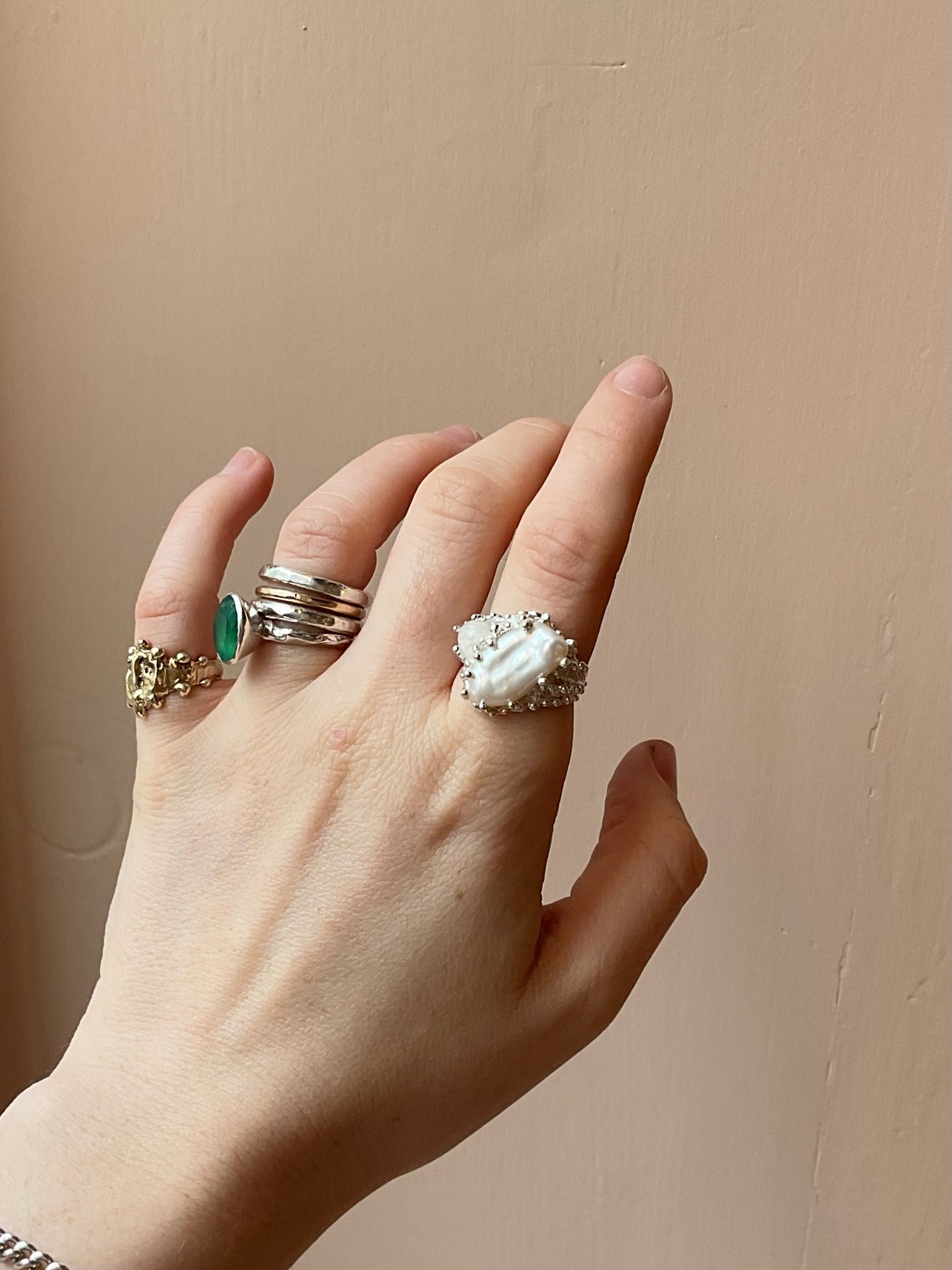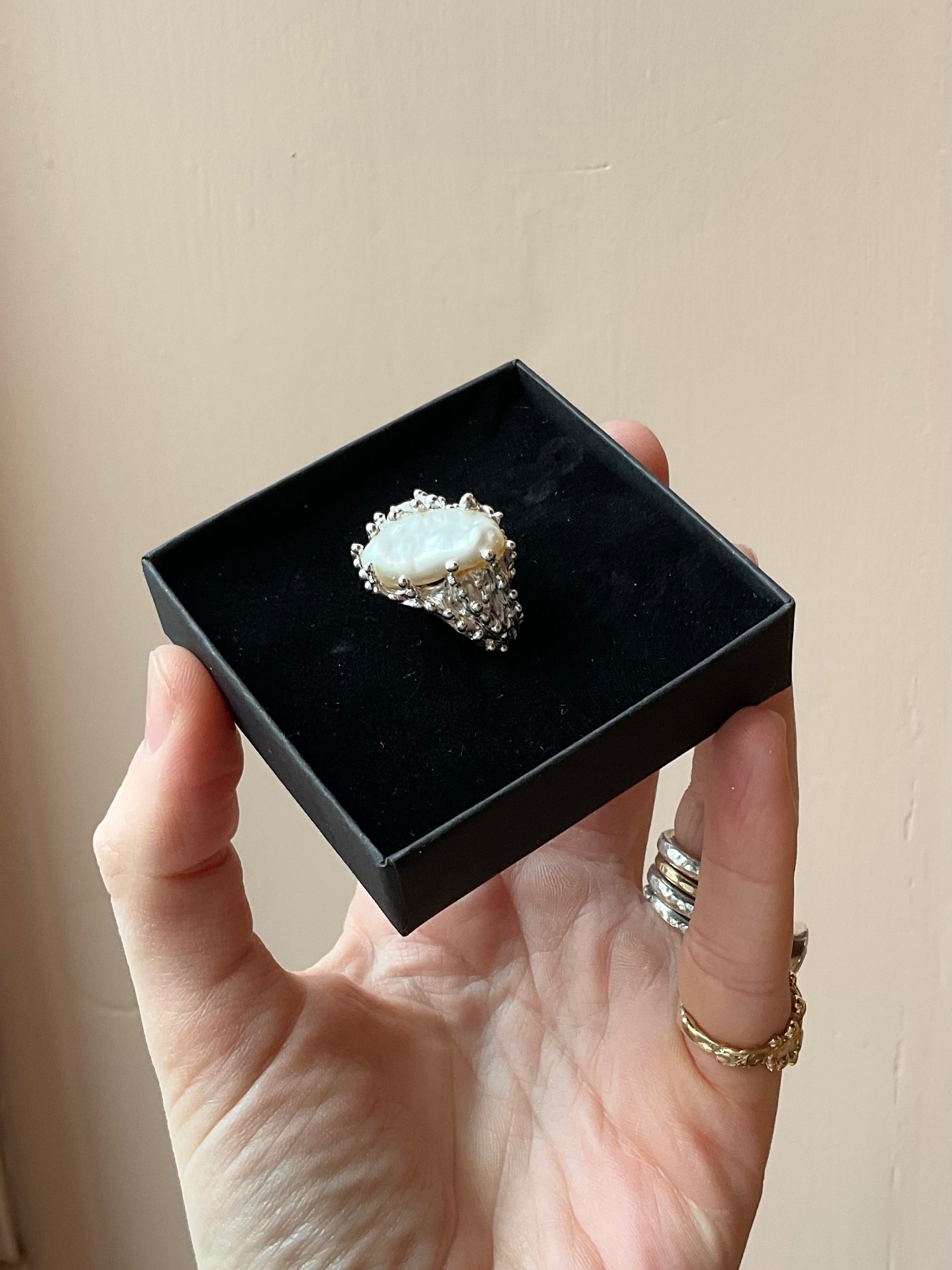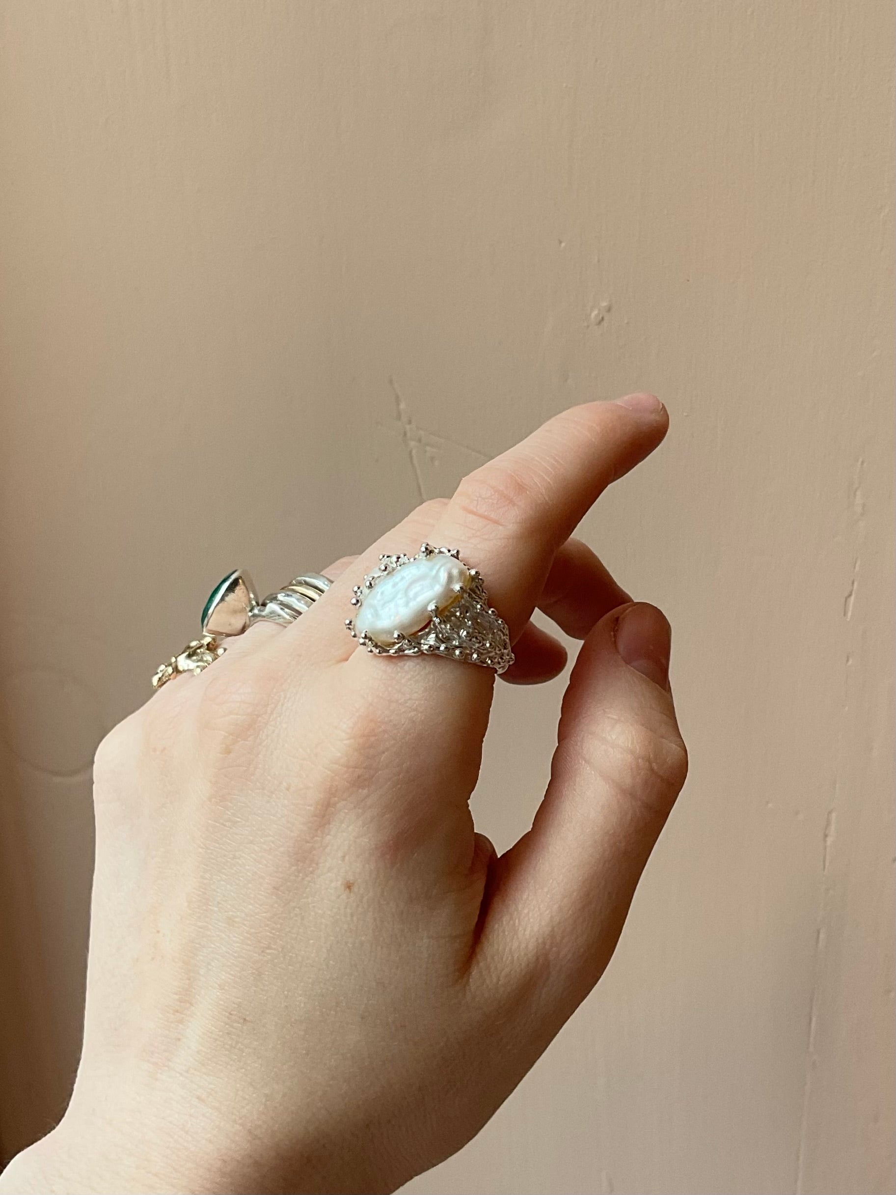 A statement ring, pearls should be treated with care, keep away from perfumes and harsh chemicals. To clean, simply while over with a silver polishing cloth or use warm soapy water.