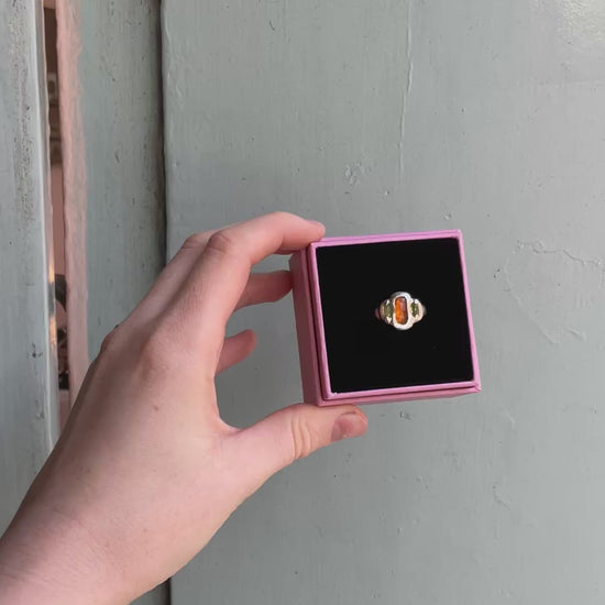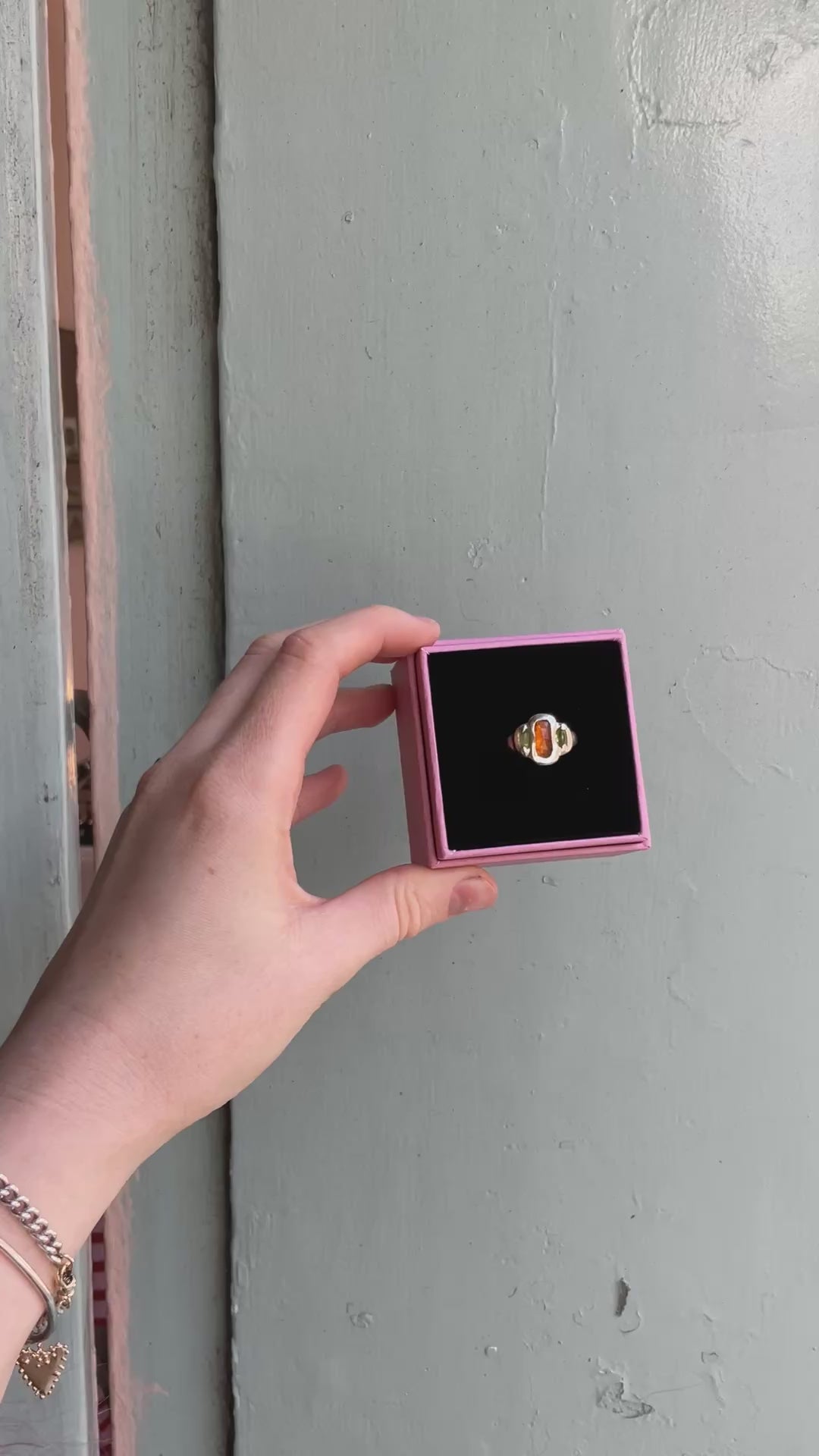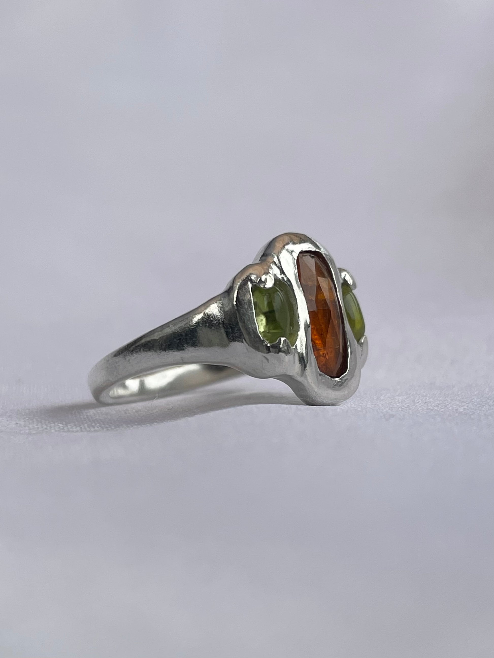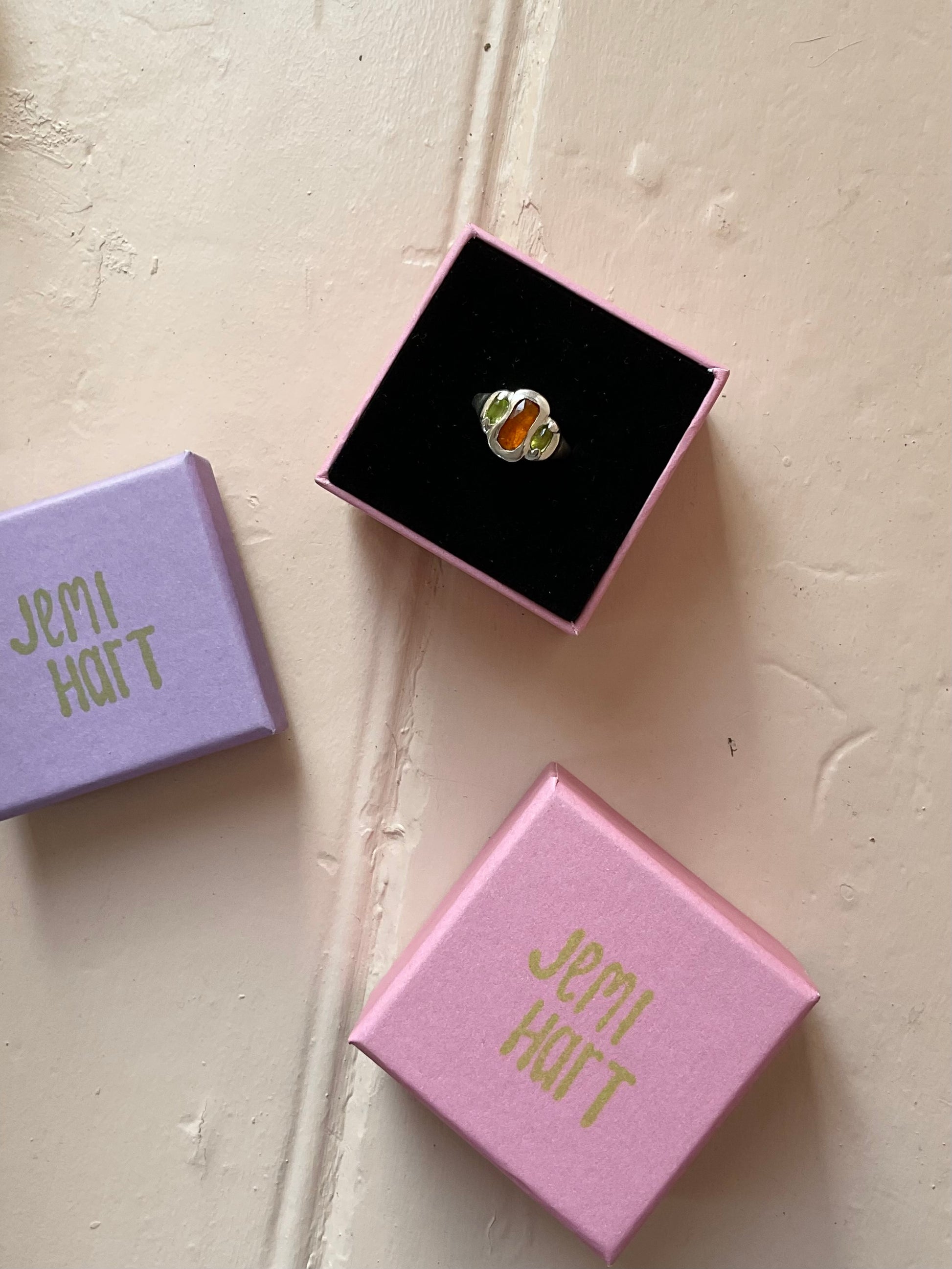 Handmade in Margate, Sterling silver chunky ring, set with a rich, zesty Kyanite, nestled between two glossy peridots. Perfect worn alone or as part of a stack, it’s low profile makes it comfortable for everyday wear.