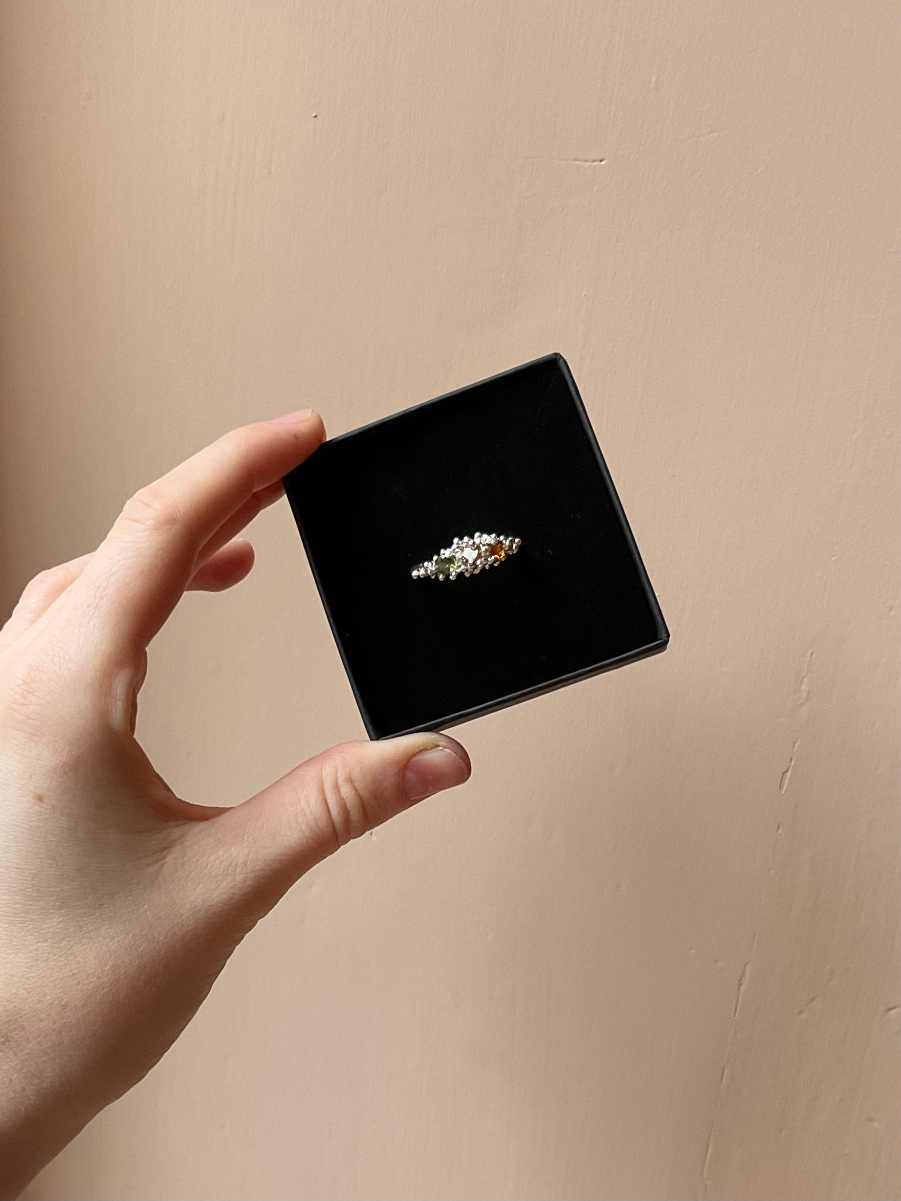Silver ‘barnacle’ encrusted claws hold in place three twinkling, round tourmalines in warm, autumnal tones, one green, one honey yellow and one rich orange.