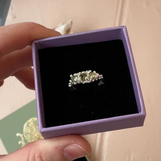Silver ‘barnacle’ encrusted claws hold in place three twinkling, round tourmalines in rich, contrasting greens.