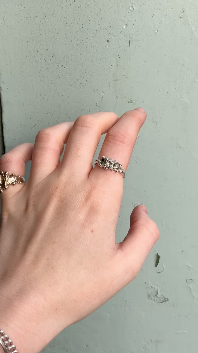 Silver ‘barnacle’ encrusted claws hold in place three twinkling, round tourmalines in rich, earthy shades of green.
