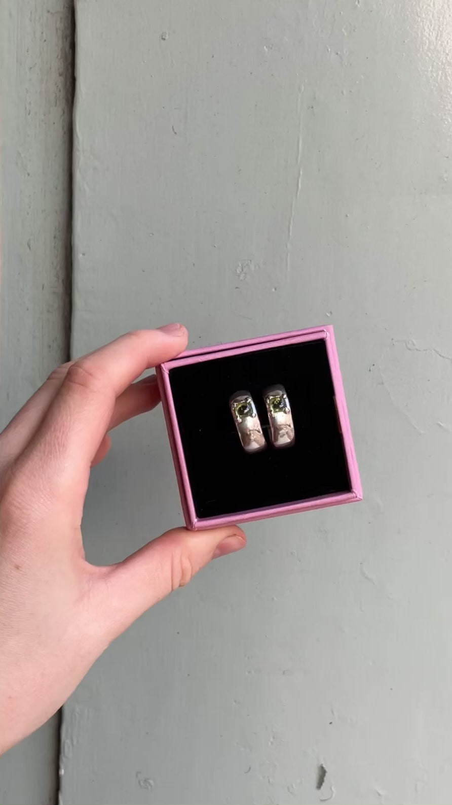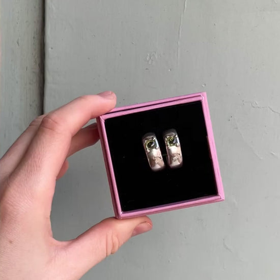 Handmade in Margate, Sterling silver hoop earrings, set with juicy green Peridots for a flash of colour, and a high shine finish. With silver posts and butterfly backs, making them easy to take in and out from day to day.