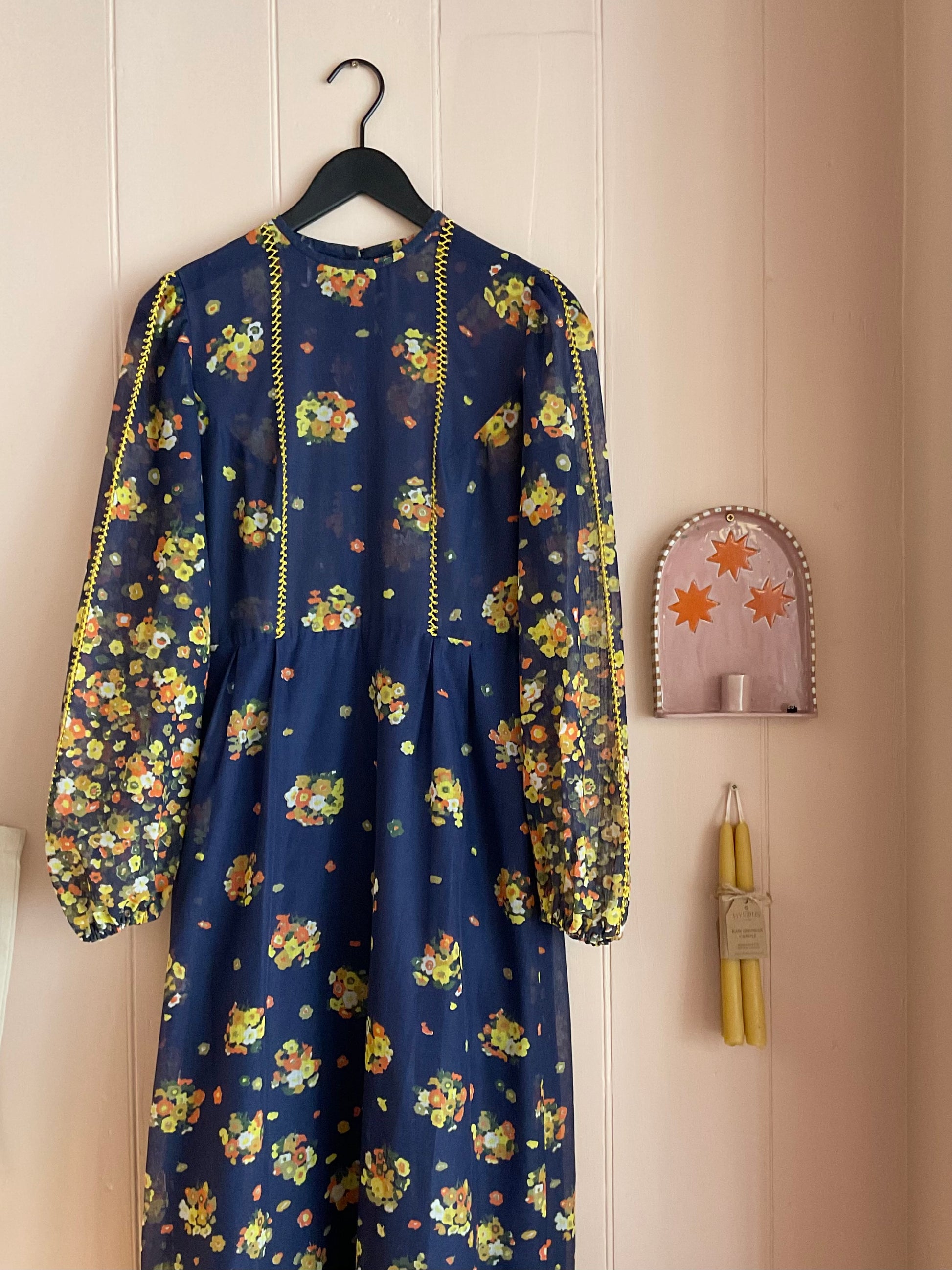 Opal exclusive, this beautiful 1970’s maxi dress, made from a sheer cotton organdie, the skirt is fully lined. The bodice and sleeves feature a contrasting, yellow ladder trim.