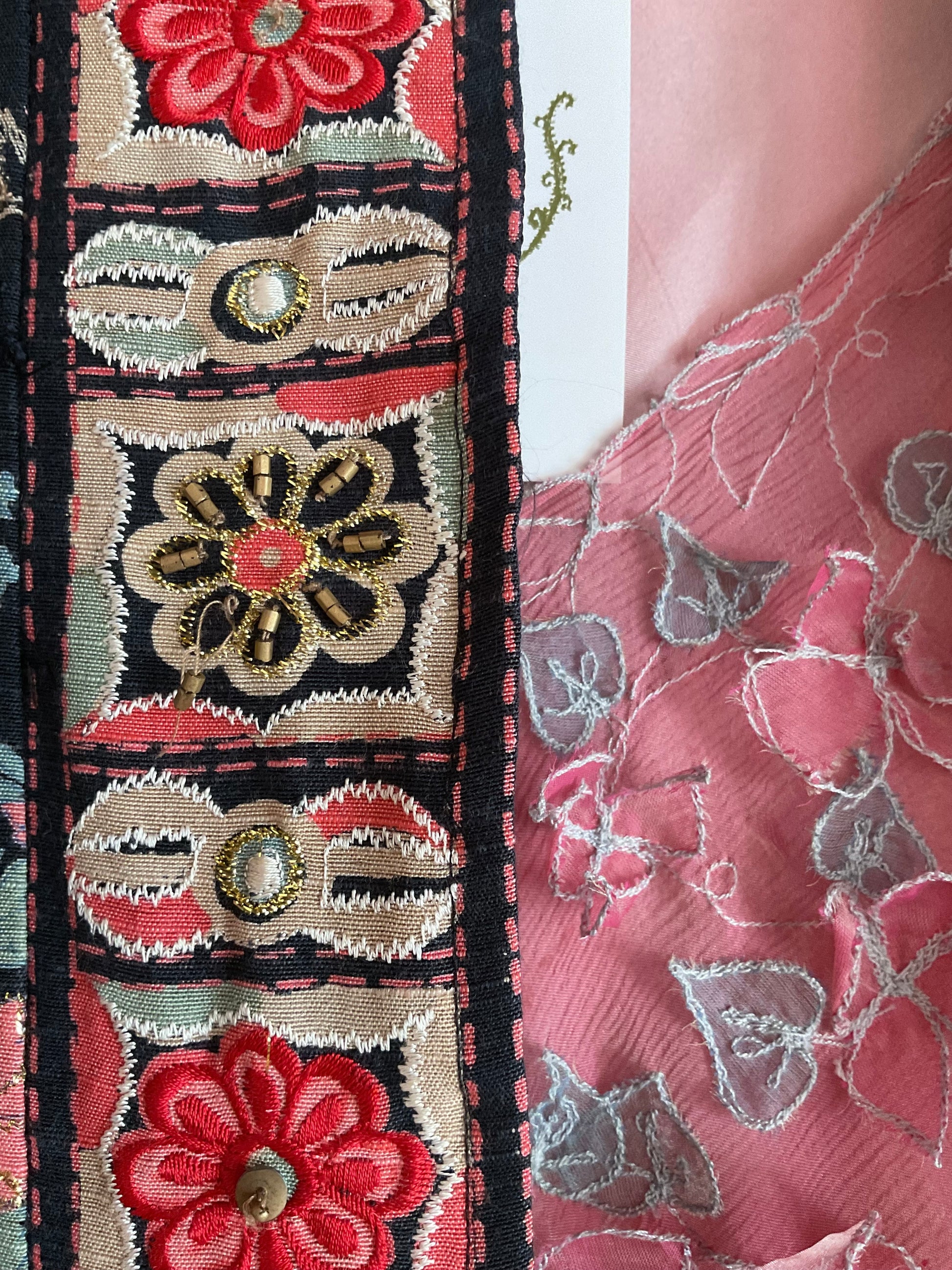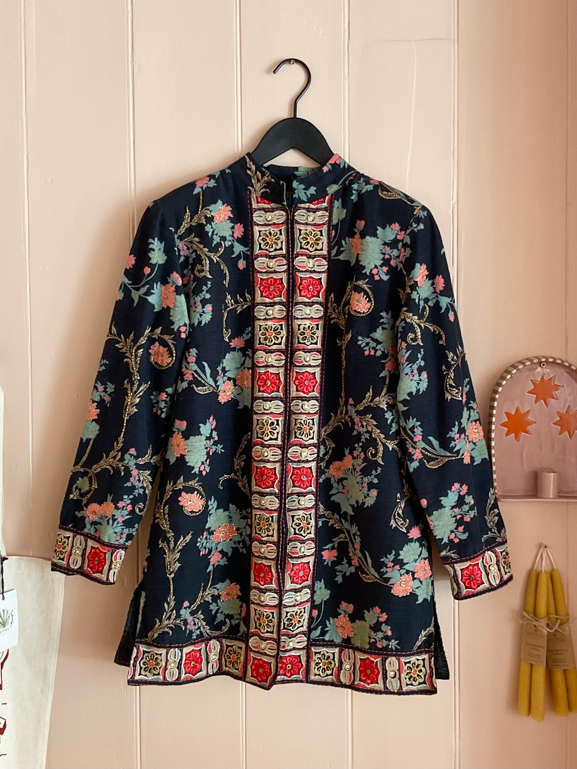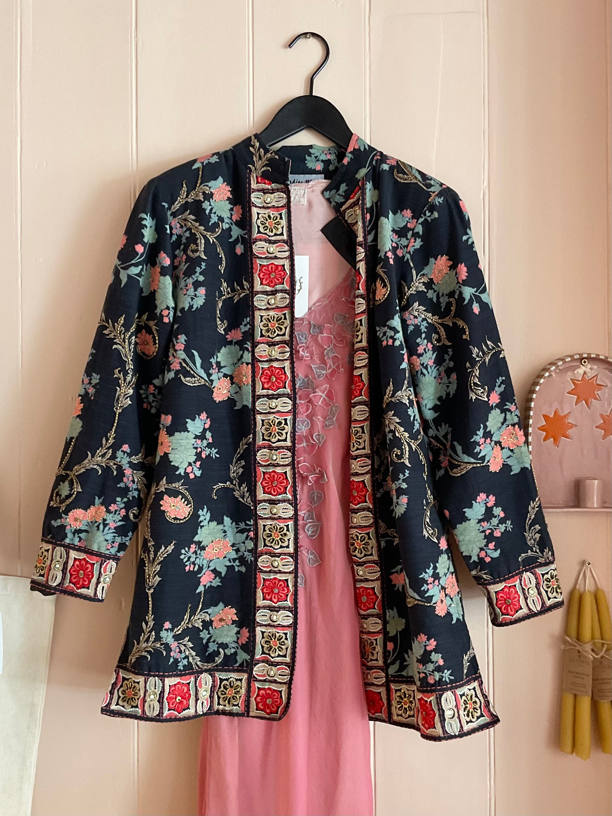 Sourced for our store by Peony Vintage, heavily embellished, navy jacket by Indigo Moon. Adorned with colourful embroidery and tiny beads and sequins, with a contrasting brocade trim and hidden hook and eye fasteners.