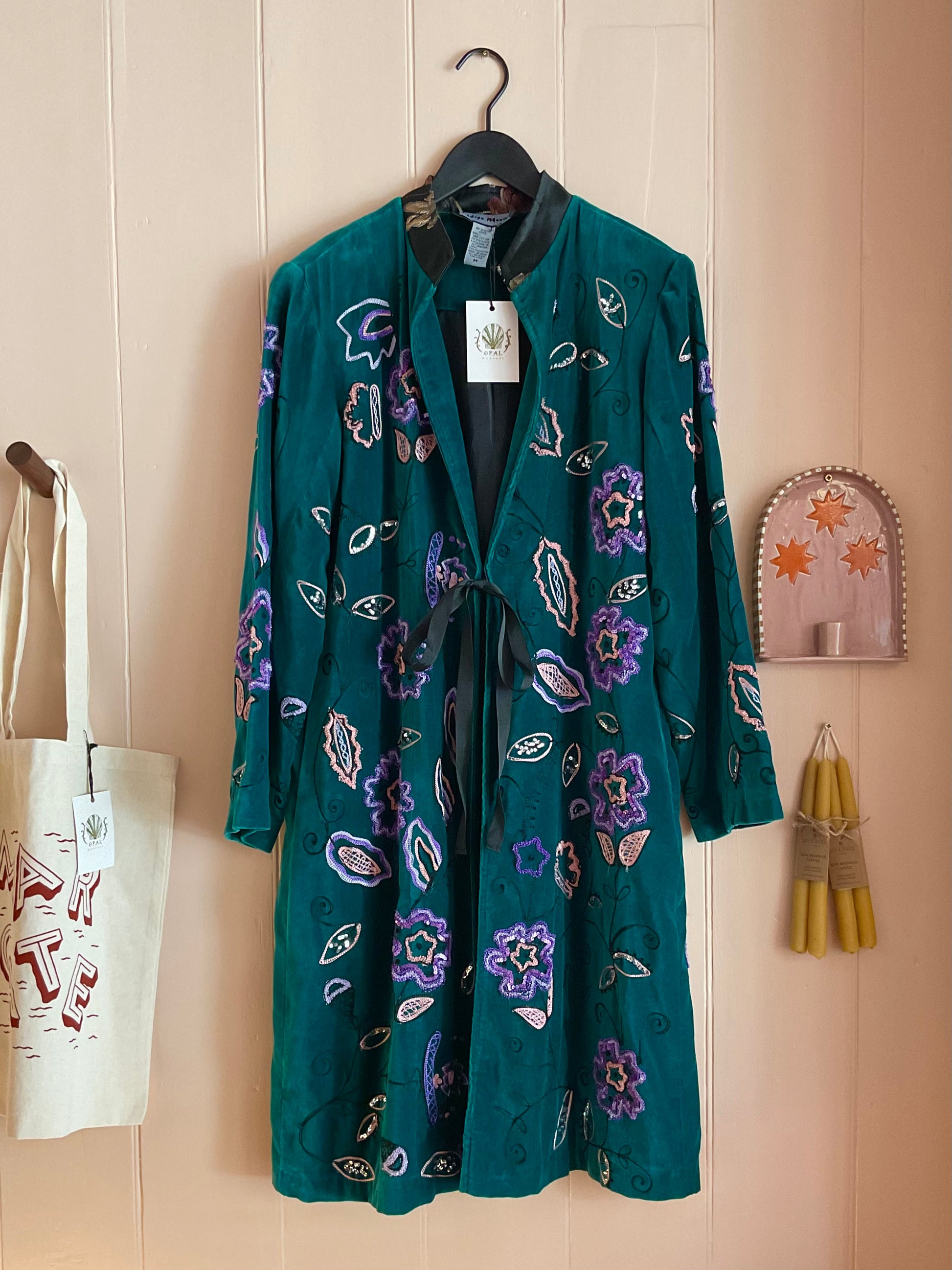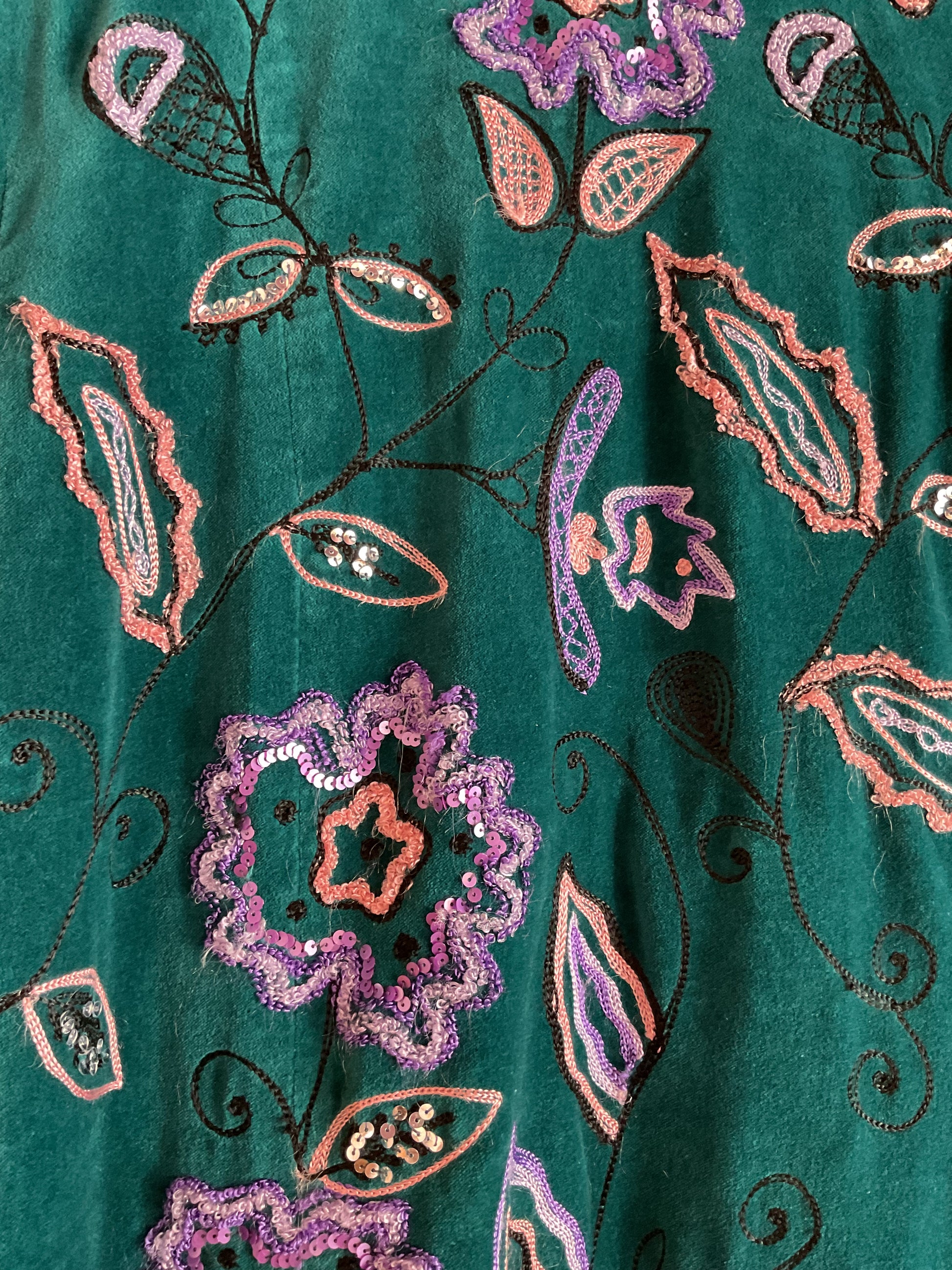 Sourced for our store by Peony Vintage, opulent, generously sized heavy teal velvet evening coat by Indigo Moon embellished with colourful embroidery and tiny sequins, with a contrasting brocade collar with black grosgrain ties.