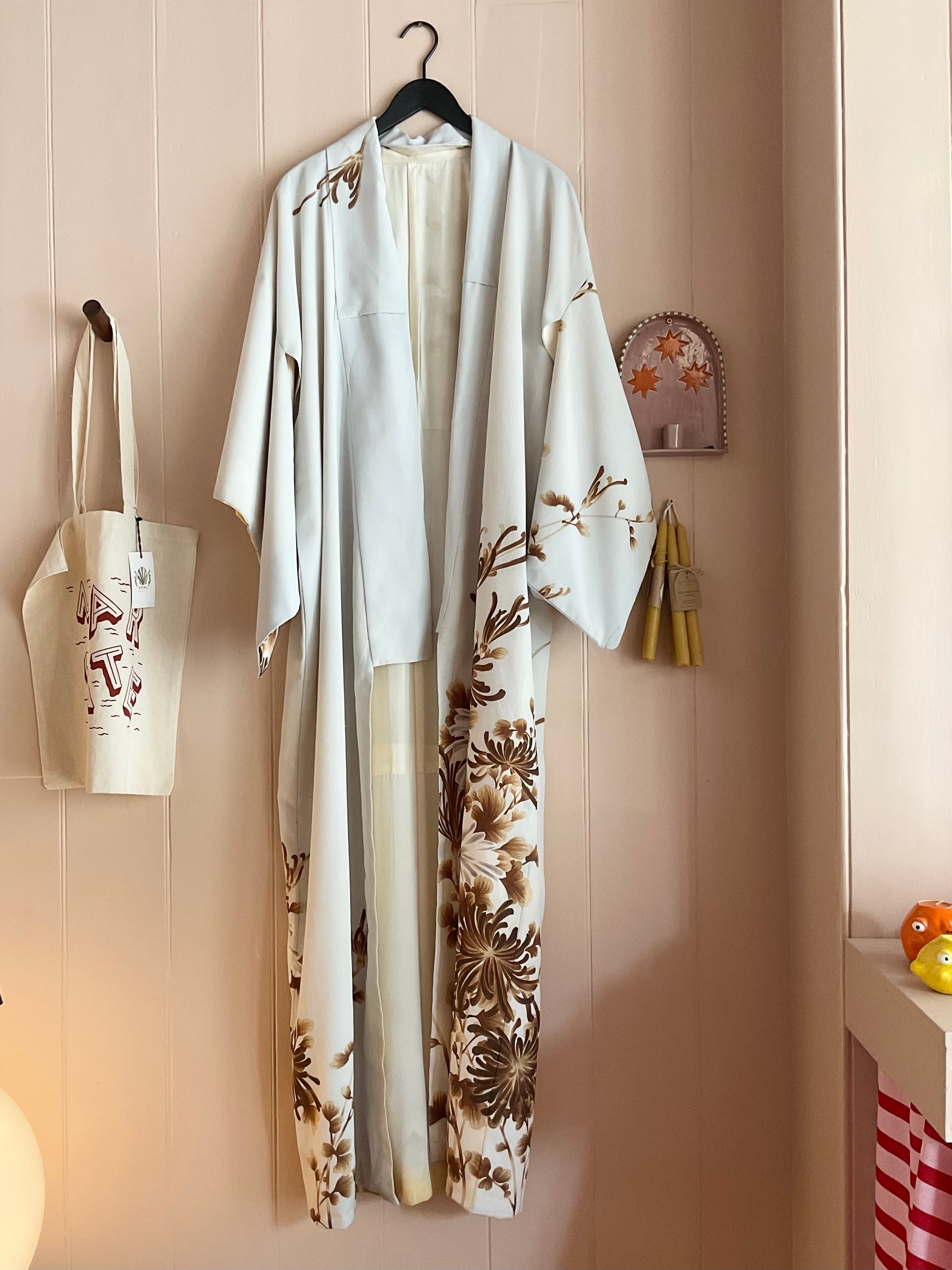Sourced for our store by Peony Vintage, beautiful full length kimono. Decorated with a floral chrysanthemum pattern in shades of rich brown, sepia and ecru. The lining has a lovely ombré effect at the he, and the sleeves, fading from a golden tone gradually into a lighter cream colour.
